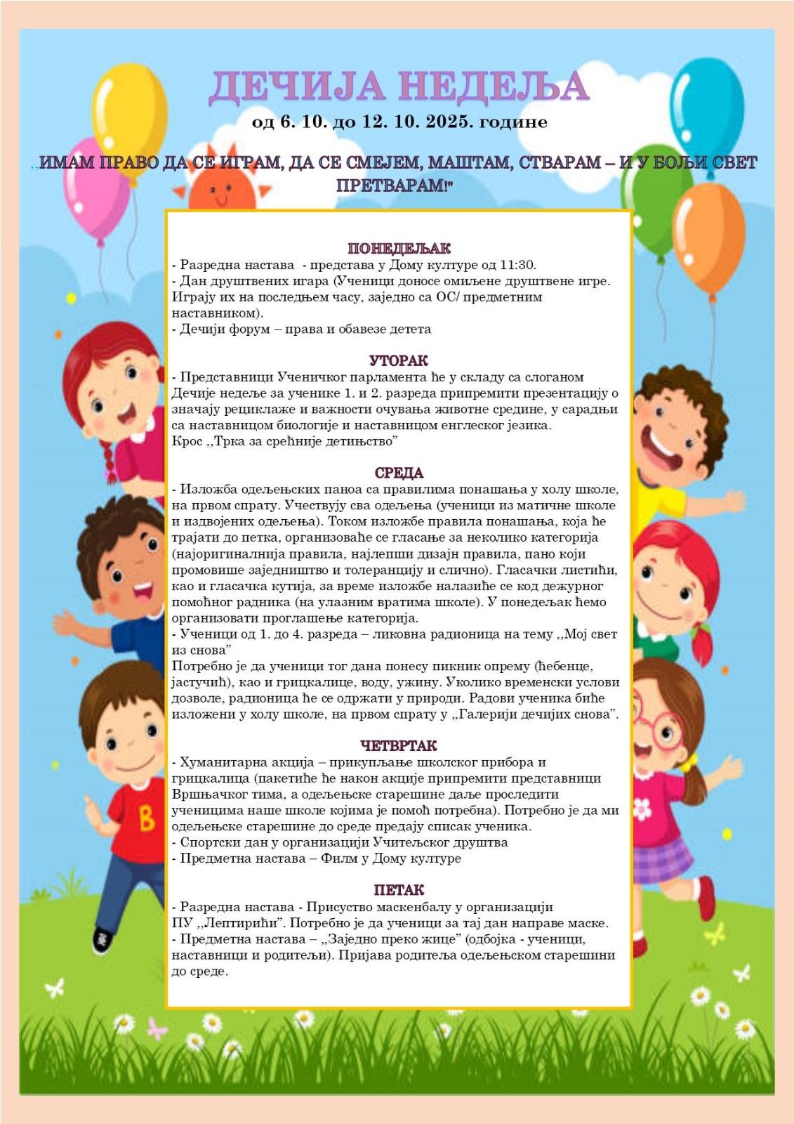 АКТИВНОСТИ ТОКОМ ДЕЧИЈЕ НЕДЕЉЕ