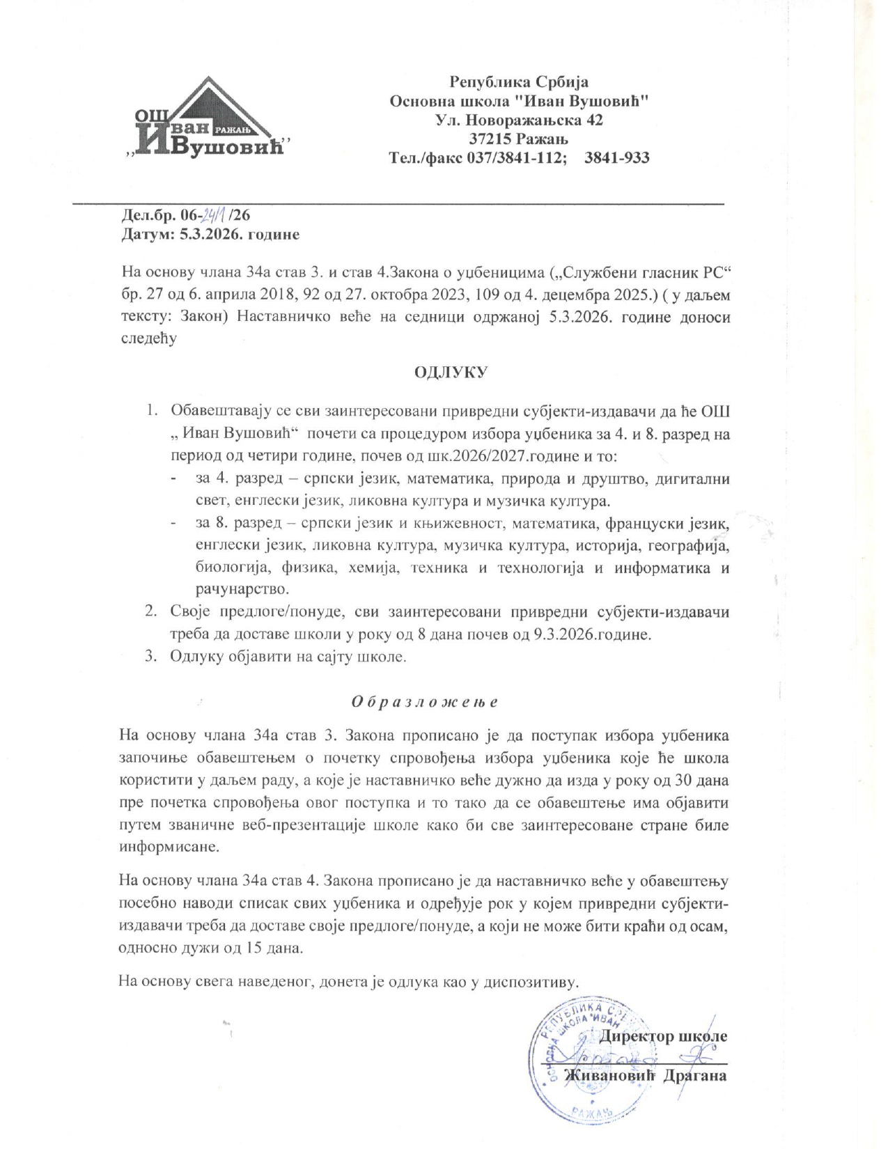 ОДЛУКА НАСТАВНИЧКОГ ВЕЋА ОШ „ИВАН ВУШОВИЋ” О ПОЧЕТКУ ПРОЦЕДУРЕ ЗА ИЗБОР УЏБЕНИКА ЗА ЧЕТВРТИ И ОСМИ РАЗРЕД НА ПЕРИОД ОД ЧЕТИРИ ГОДИНЕ